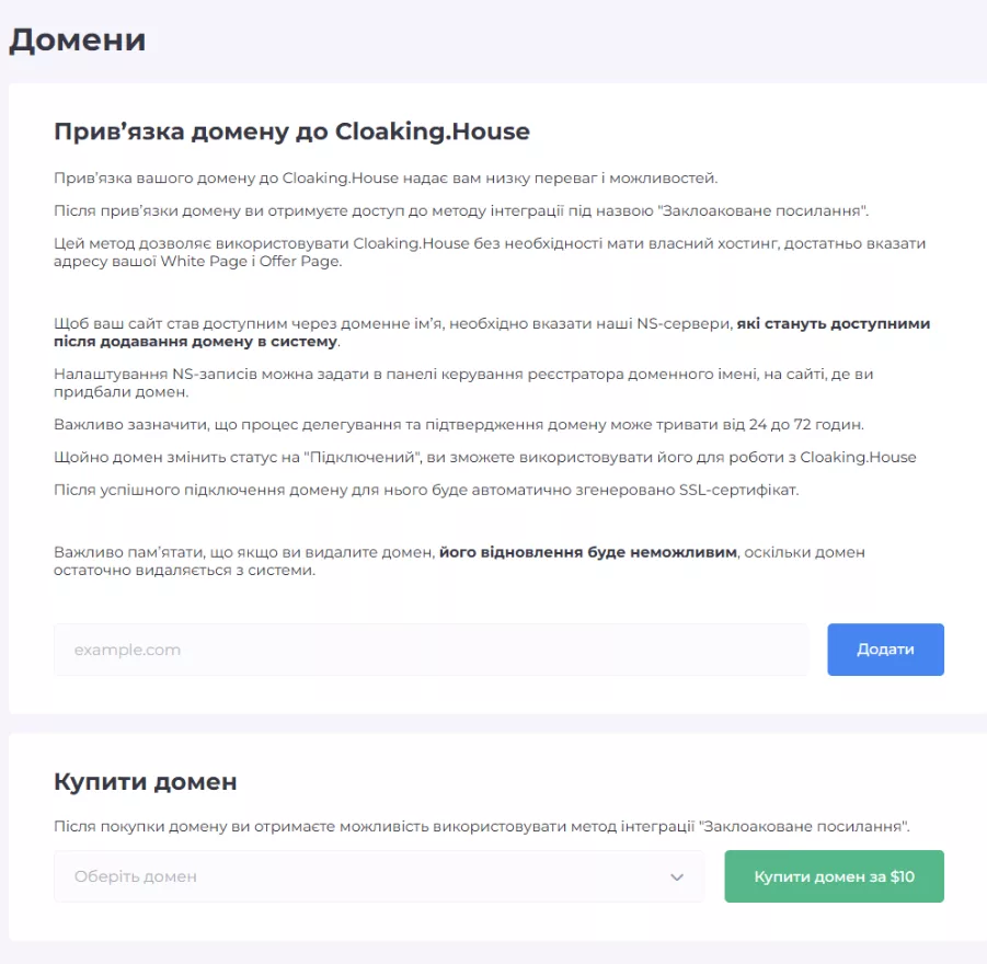 Інтеграція через php — найбільш доступний варіант. Проте ви також можете одразу згенерувати посилання, яке вже міститиме усі налаштування. Для цього вам треба попередньо припаркувати домен в меню “Домени”.