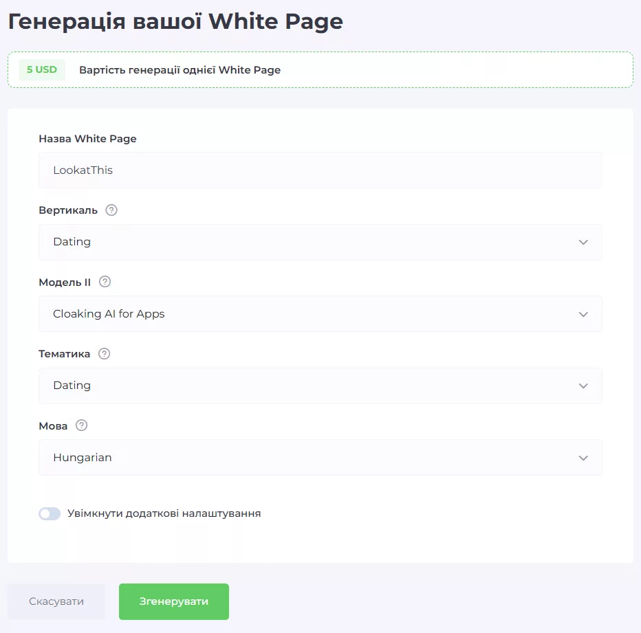 Але за що взагалі пропонують заплатити? Розпочнемо з головної фішки — генератор White Page.