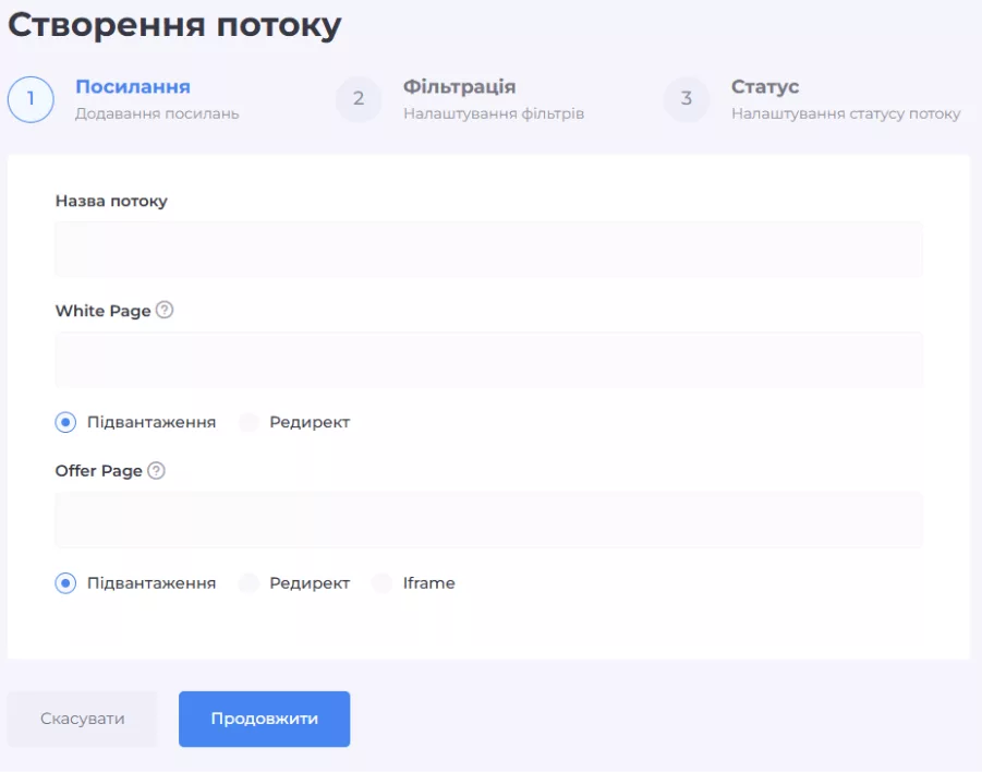 Треба задати назву потоку, додати адресу White Page, прив’язати сторінку офера. Це перший етап.