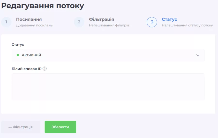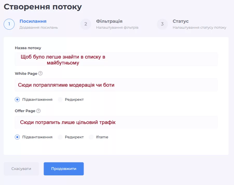 Наступним ми задаємо назву нашому потоку. Також обираємо адреси, куди потраплятиме небажаний трафік, себто вайтпейдж, а куди литиметься цільовий. Тобто задаємо white page та адресу нашого лендінгу, як це ви бачите на скріні.