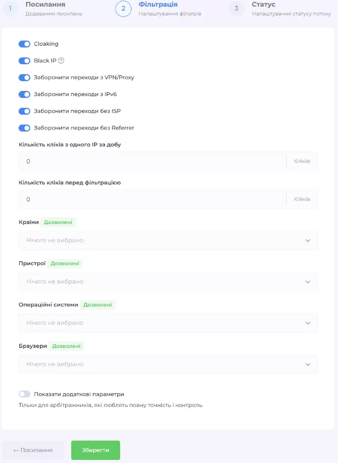 Тобто обираючи в розділі “Країни” умовно Сполучені Штати, це означатиме, що виключно такий трафік буде потрапляти на цільову сторінку. А усі інші будуть направлятися на White Page. Так само і з налаштуваннями браузера, ОС тощо.