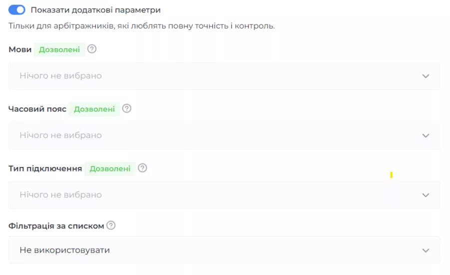 Ця опція особливо важлива для арбітражників. Адже дозволяє ще точніше відсортувати трафік. Наприклад, обираючи ГЕО Чехія, є шанс, що на лендінг потрапить не лише чех, а й українець. Бо в цій країні дуже багато біженців та просто мігрантів. І якщо ви не зацікавлені в такому трафіку, то можете обмежити його ще й за мовою.