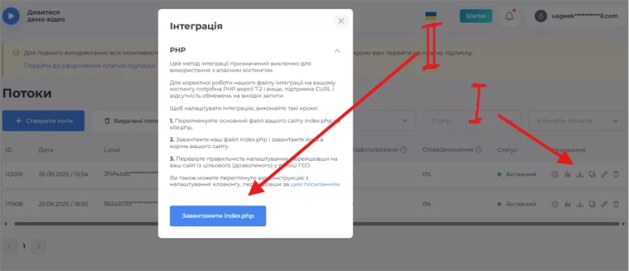 Далі обираємо статус “Активний”, після чого лишається інтегрувати клоакінг собі на сайт. Для цього праворуч від потоку, в категорії “Керування”, треба натиснути на іконку завантаження. Після чого ми отримуємо можливість завантажити наш модифікований index.php. Додаємо його собі на сайт, попередньо створивши бекап.