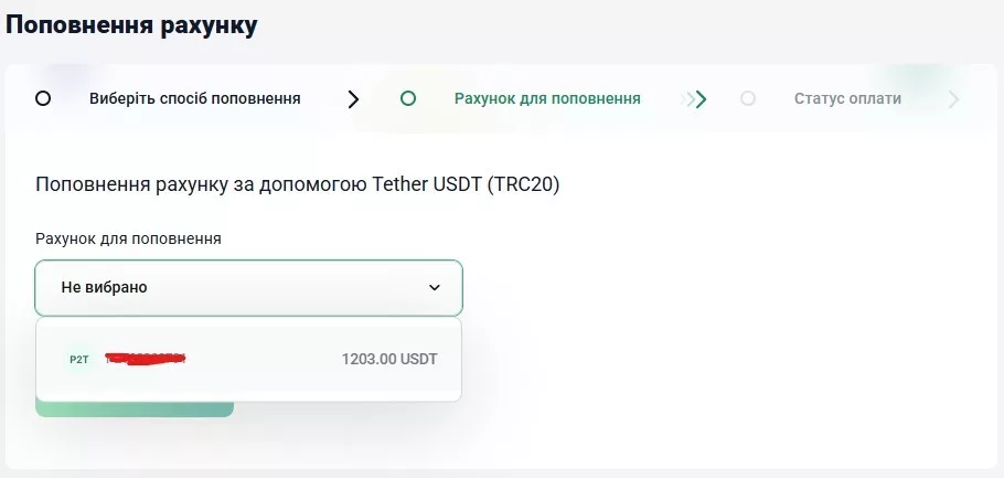 Якщо раптом в процесі поповнення через USDT ви не бачите жодного рахунку, то це лише тому, що перед цим необхідно відкрити той самий рахунок в сервісі. Робиться це в декілька кліків, після чого можна поповнити баланс криптою.